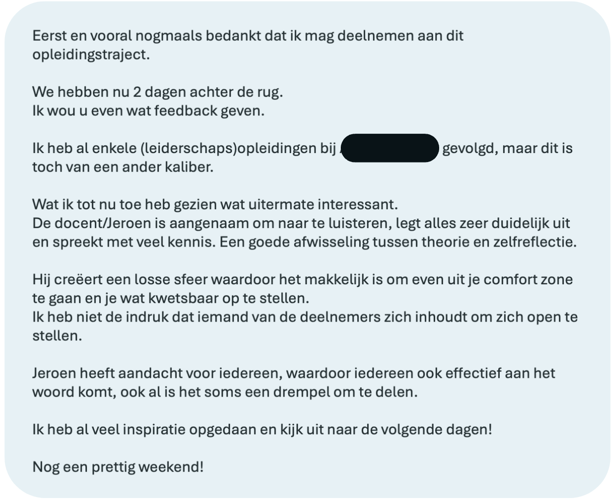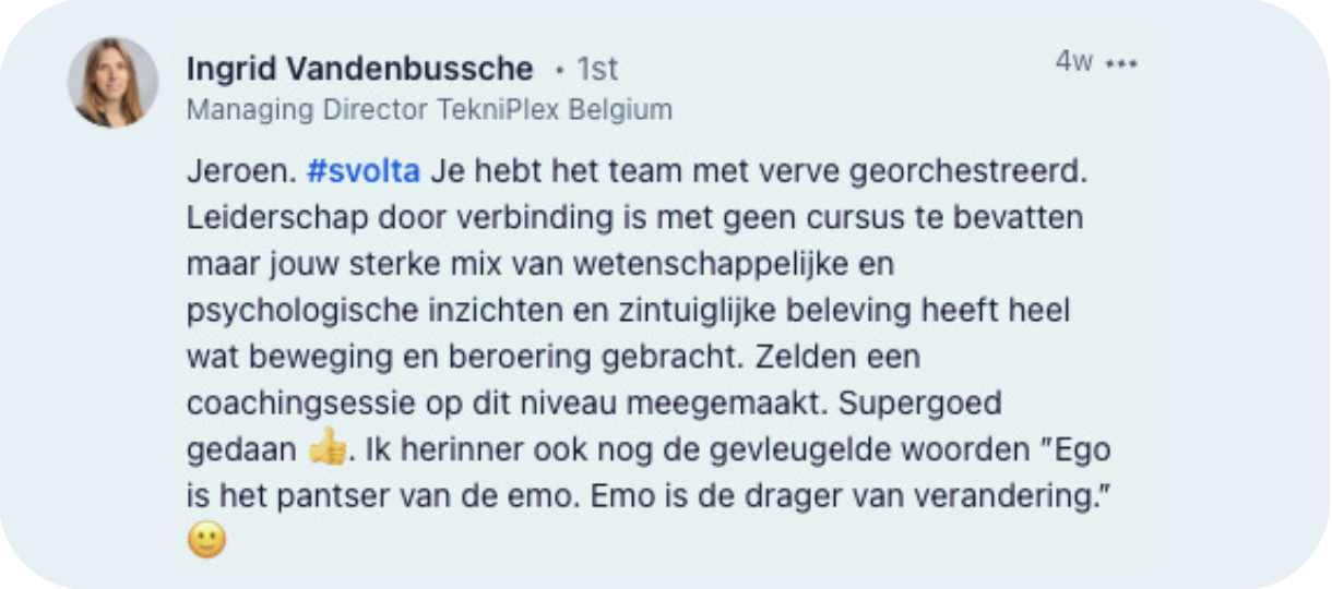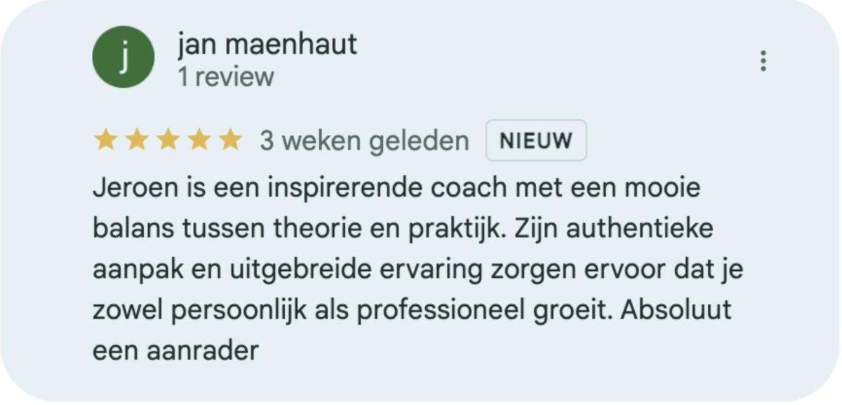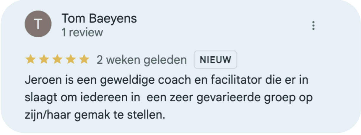 Jeroen, je bent een topkerel die het vak trainen/coachen zeer onder de knie heeft. Het vermogen en de rust die jij meebrengt zorgt ervoor dat zelfs gesloten mensen als ikzelf mezelf hebben durven openstellen. Dat is in precies 40 jaar nog niemand gelukt dus zie dat maar als een groot compliment.